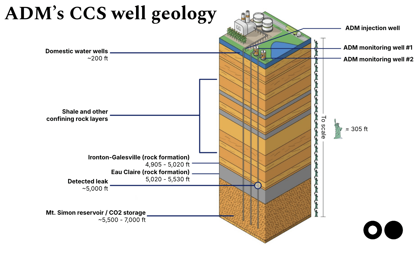 - The EPA did not require ADM to stop injecting CO2 per the company’s EPA-approved emergency response plan. Injection was allowed to continue with just one monitoring well for a full year before ADM voluntarily paused CO2 injection after they learned their second monitoring well had leaked.
